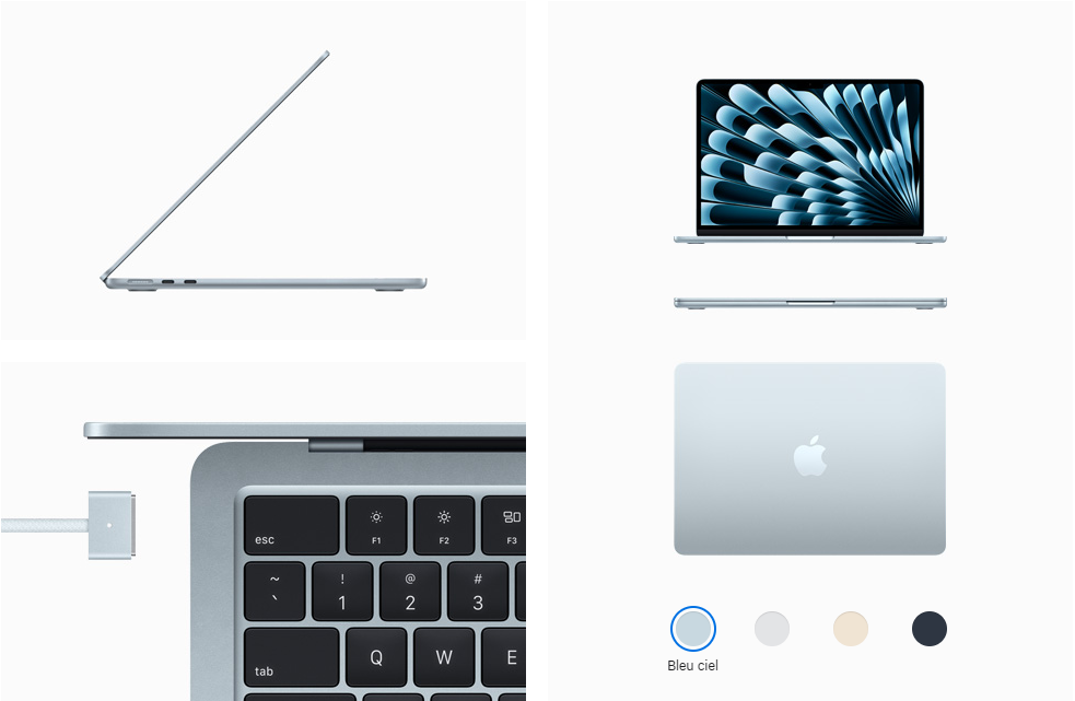 Il y a une nouvelle couleur dans l’air. Faites votre choix entre quatre finitions sublimes, dont le tout nouveau bleu ciel. Et chaque MacBook Air s’accompagne d’un câble de charge MagSafe assorti.